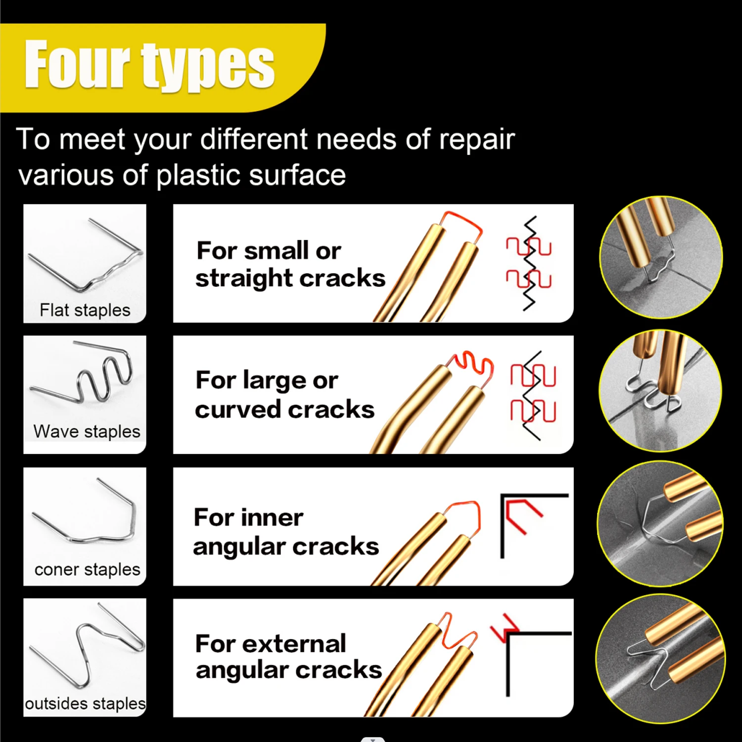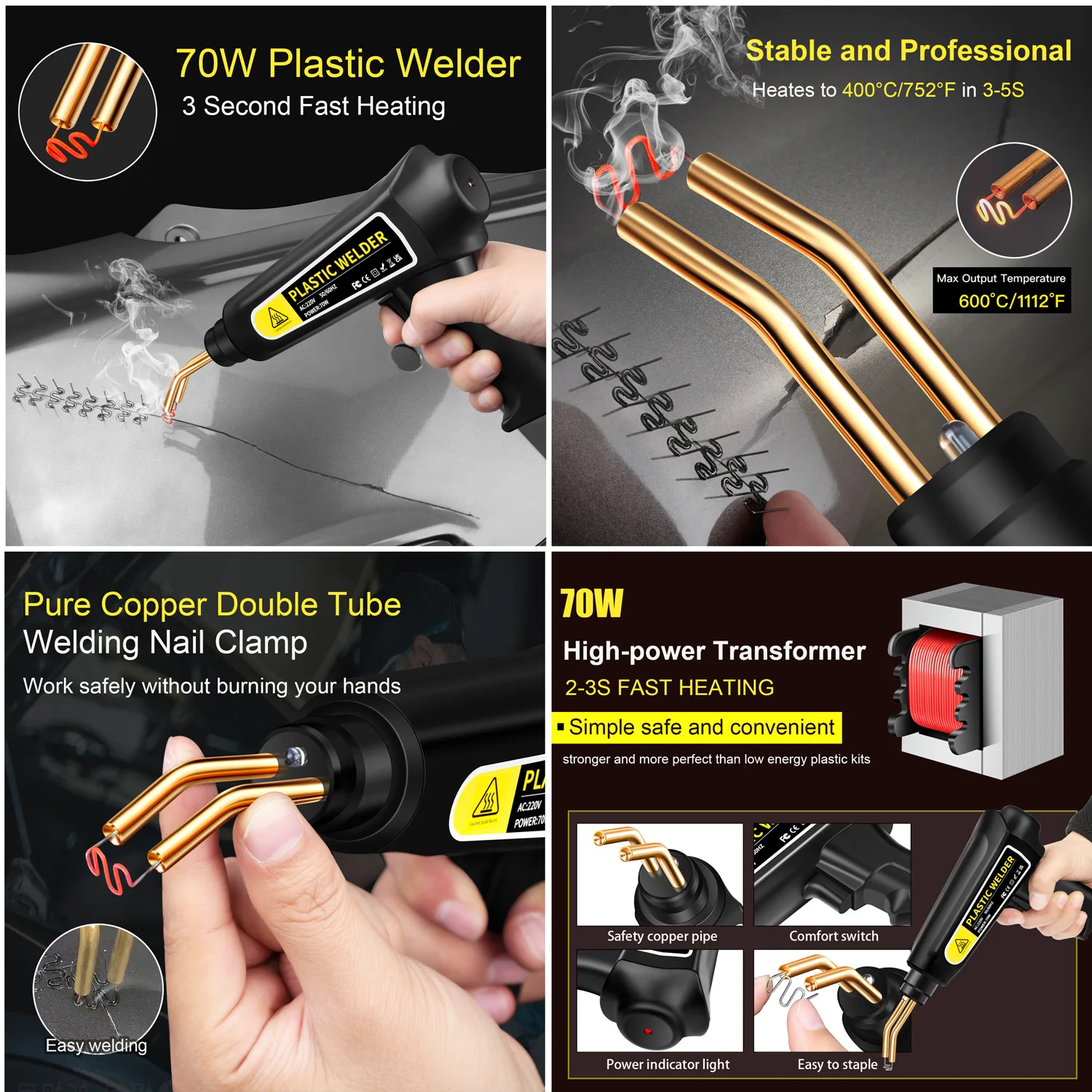 Repairs at least 98% of the plastics on the market. Perfect for repairing: bumper, dashboard, lamp holder, plastic ring, radiator, spoiler, handles, headlights, plastic wings, car and motorcycle plastic device, etc.