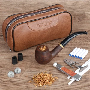 Solid wood tobacco pipe with many tobacco pipe accessories and high quality brown tobacco pipe pouch