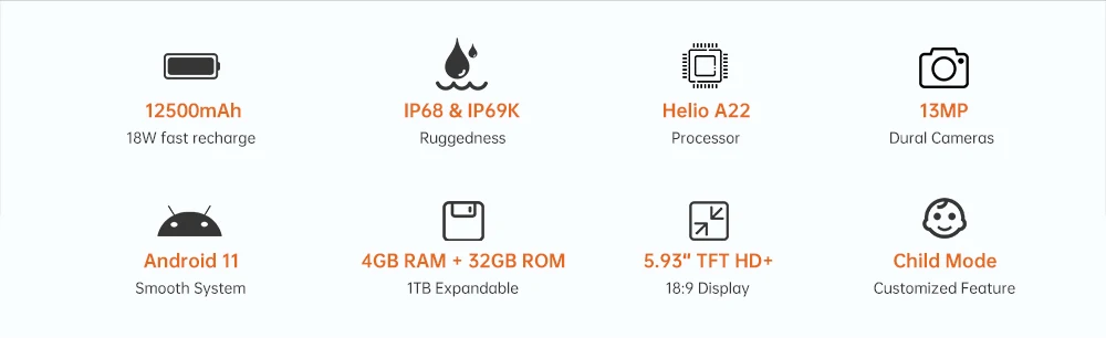 OUKITEL WP18 12500mAh Battery Rugged Smartphone 4GB+32GB 5.93"HD Quad-Core Helio A22 Cell Phone Android 11 Mobile Phone