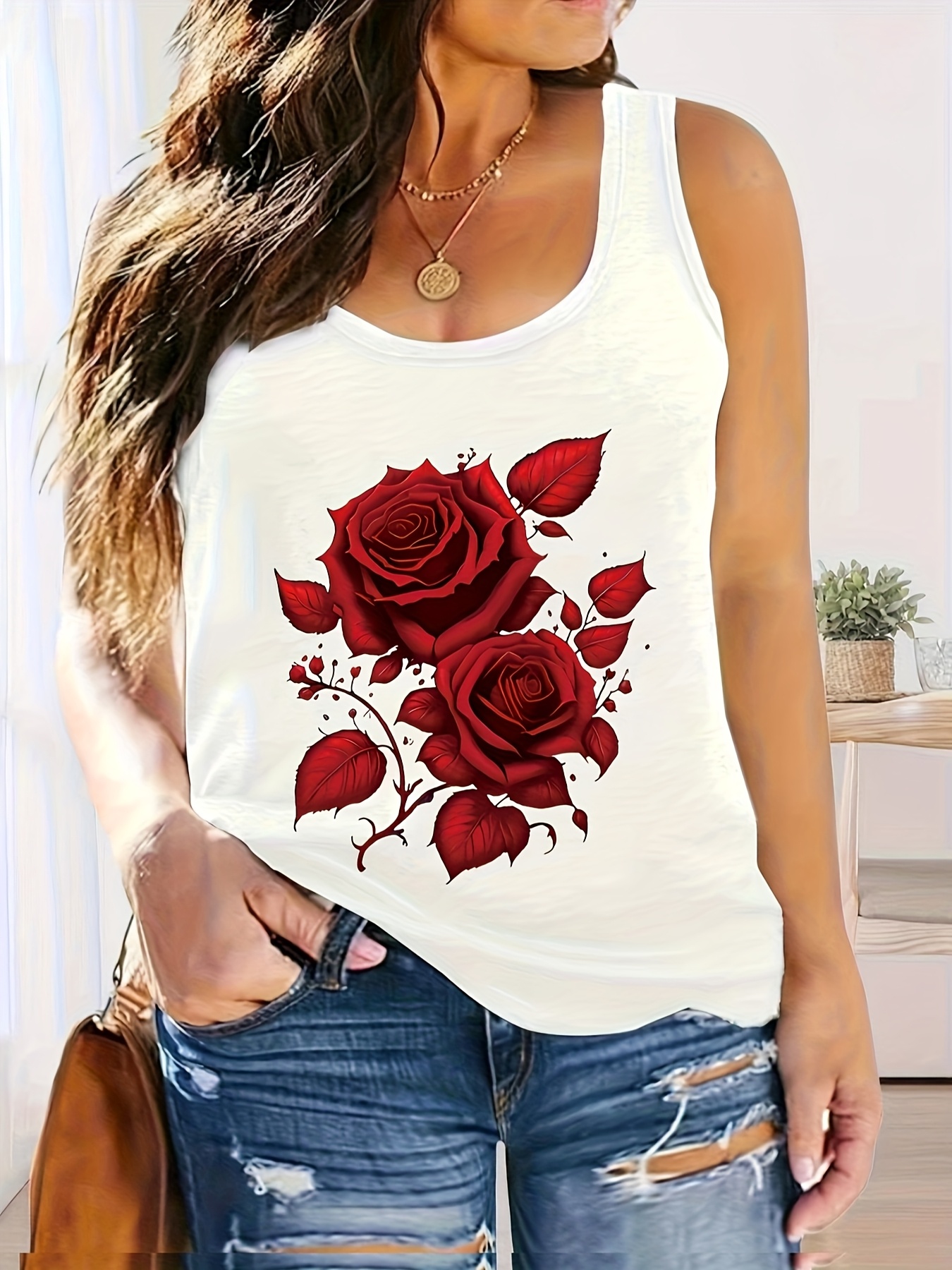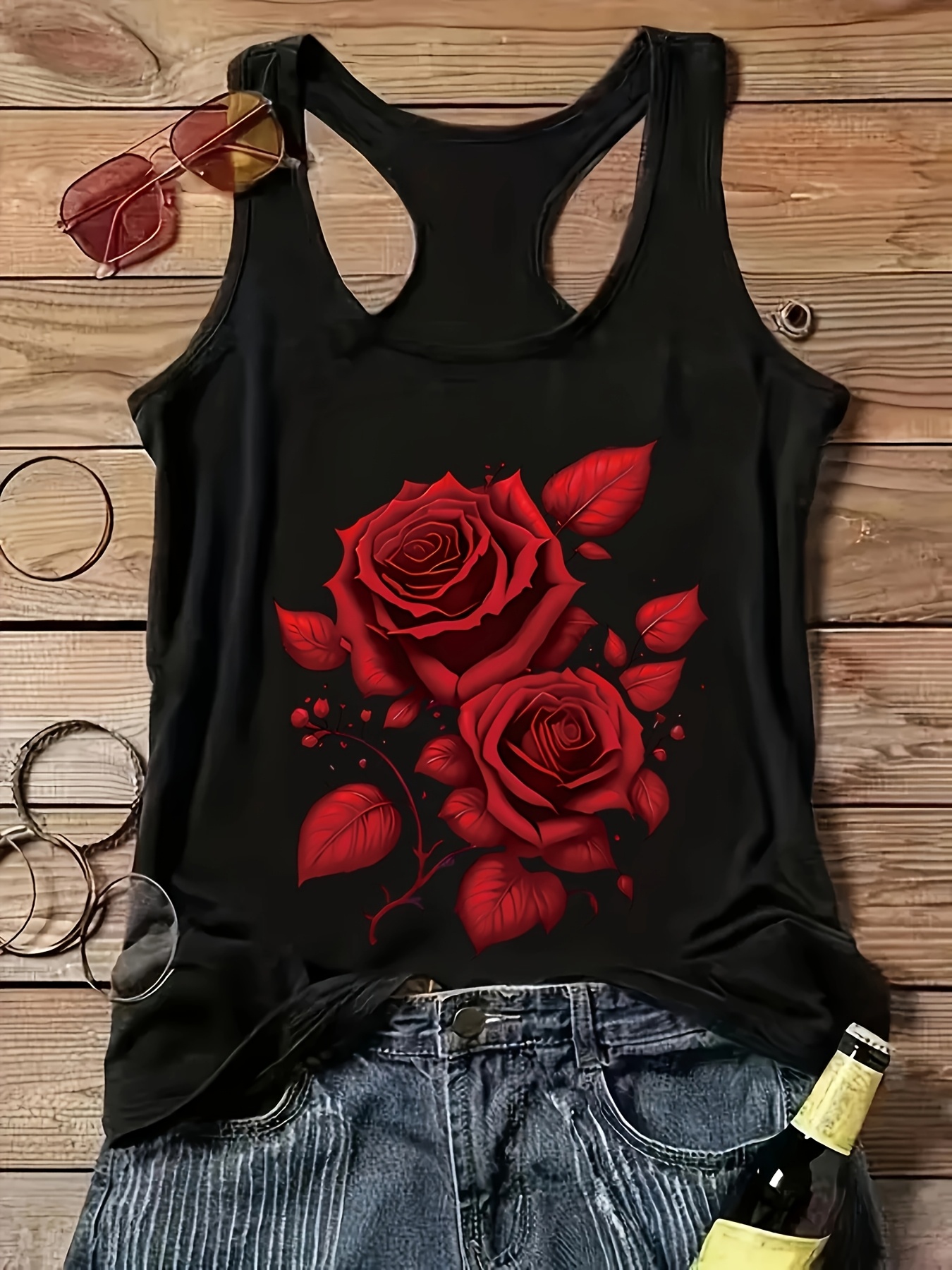 Women's Vacation-Style Off-Shoulder Tank Top with Red Rose Print, Casual Sleeveless Shirt for Spring/Summer, Machine Washable, Polyester and Elastane Blend